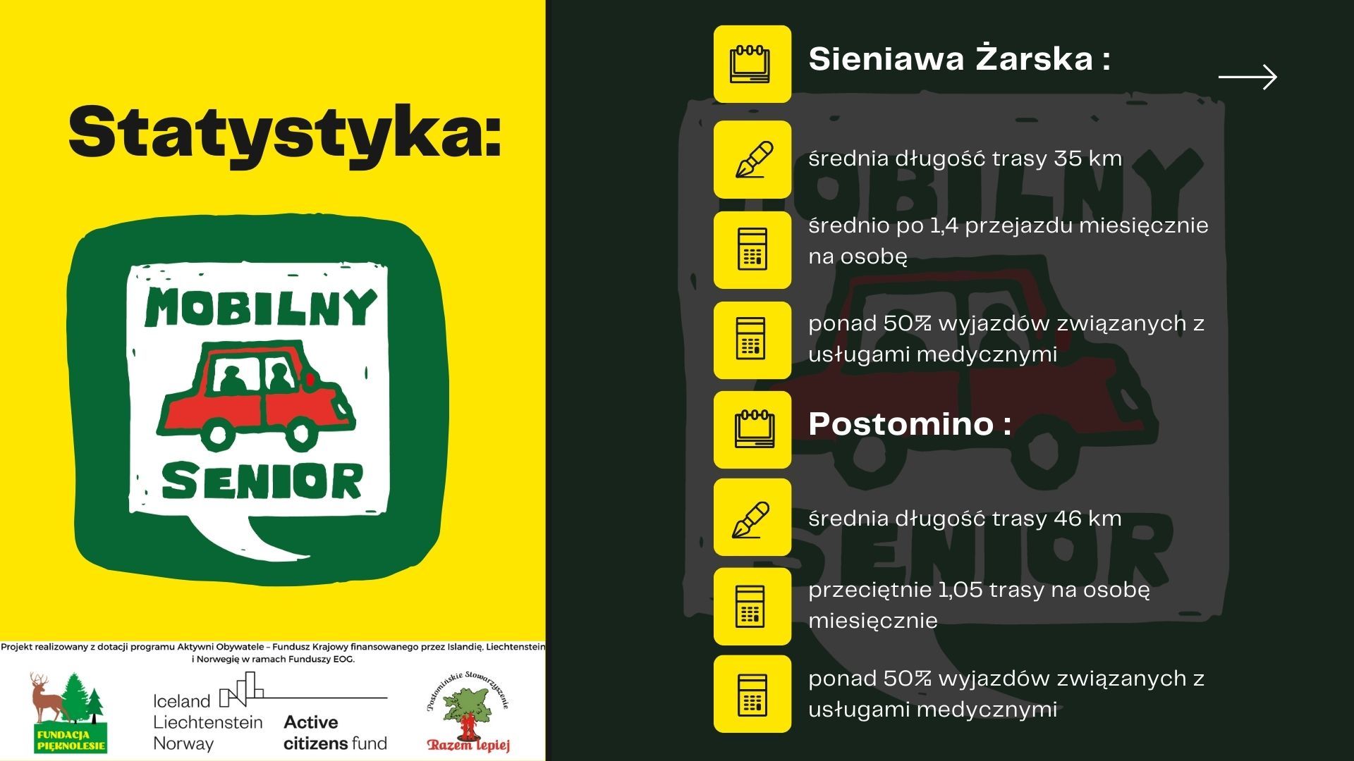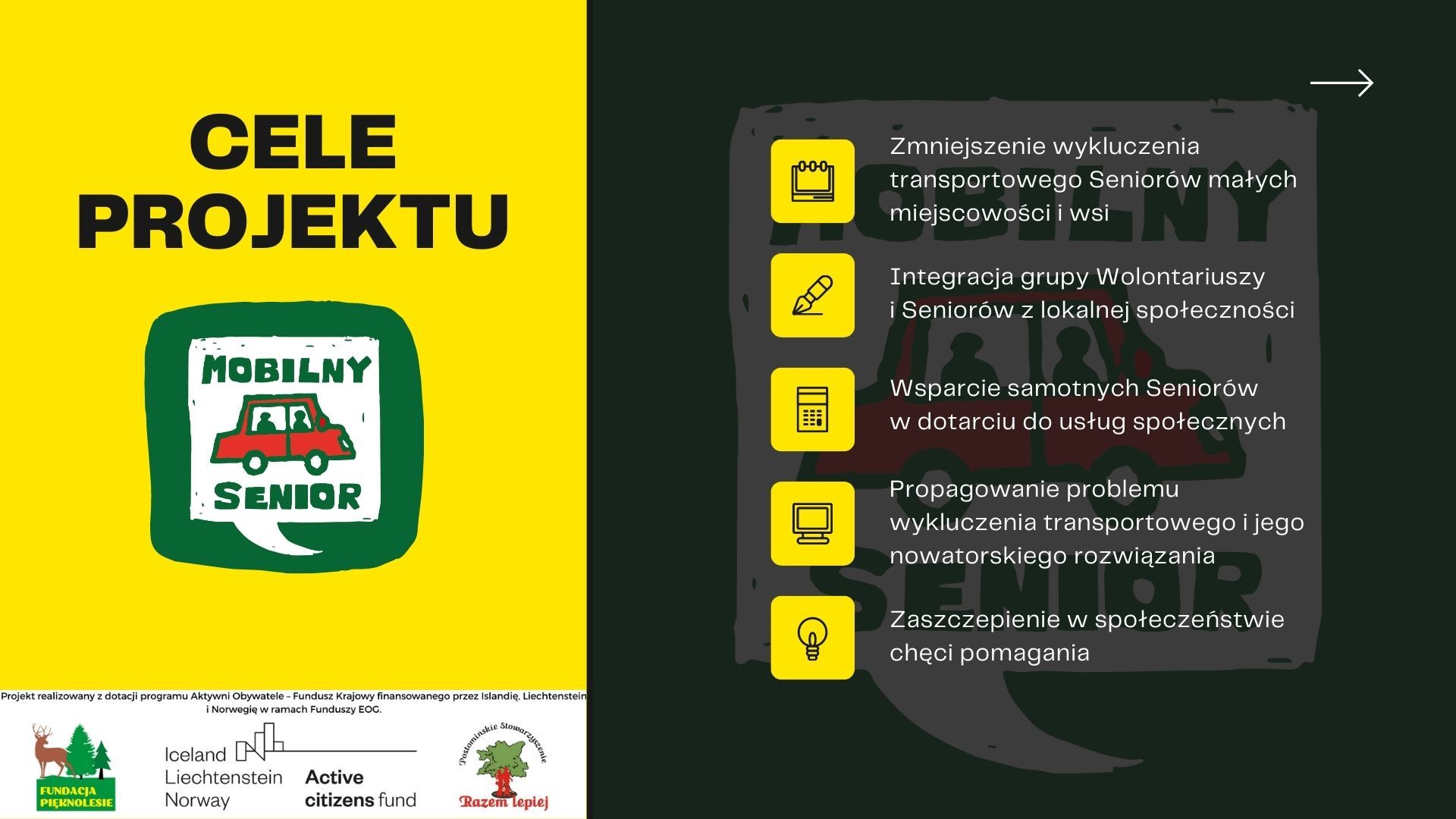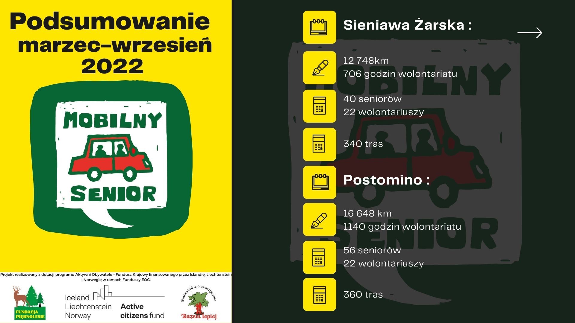 W celu zapewnienia rozpoznawalności wsparcia oferowanego w ramach projektu podjęto działania wizerunkowe i promocyjne, wśród których znalazły się między innymi przygotowanie i wdrożenie identyfikacji wizualnej dla projektu pod nazwą Mobilny Senior i Mobilny Wolontariusz.
